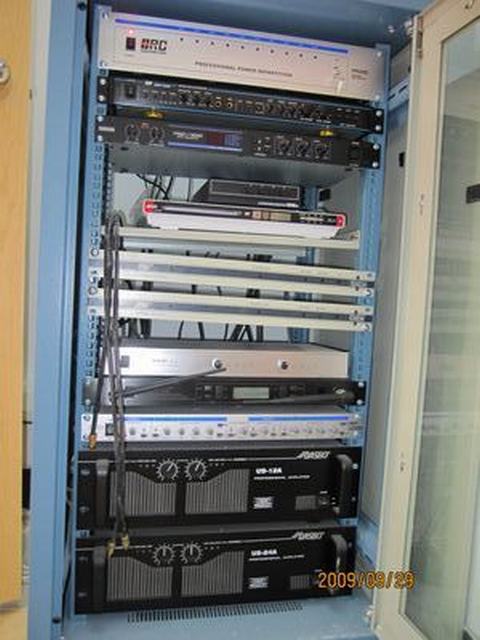 小剧场多媒体系统——剧场安装了电动升降数据投影仪、电动屏幕、灯光系统、硬盘录像机、安装在剧场内的360°摄像头可进行全程录像、转播。