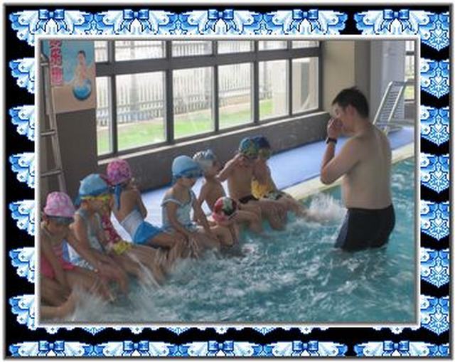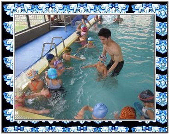 我园的儿童游泳馆,是常州市区唯一拥有室内恒温全套自动水循环系统的儿童泳池。今天,中大班的游泳课程开始啦!瞧,小朋友们换上自己色彩亮丽的可爱泳衣,来到游泳馆。试试水温、打打水……跟着专业的教练做完了准备动作,正式下水了喽!一个跟着一个,扶好池壁,漫步在泳池里,小朋友们兴奋极了!从战战兢兢地下水试温到兴奋异常地在泳池里走步、跳跃,小朋友们在游泳课中感受到了在温水中游泳的乐趣,尽享着在蓝色水世界里撒欢的酣畅!
