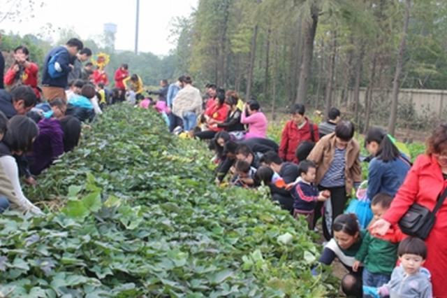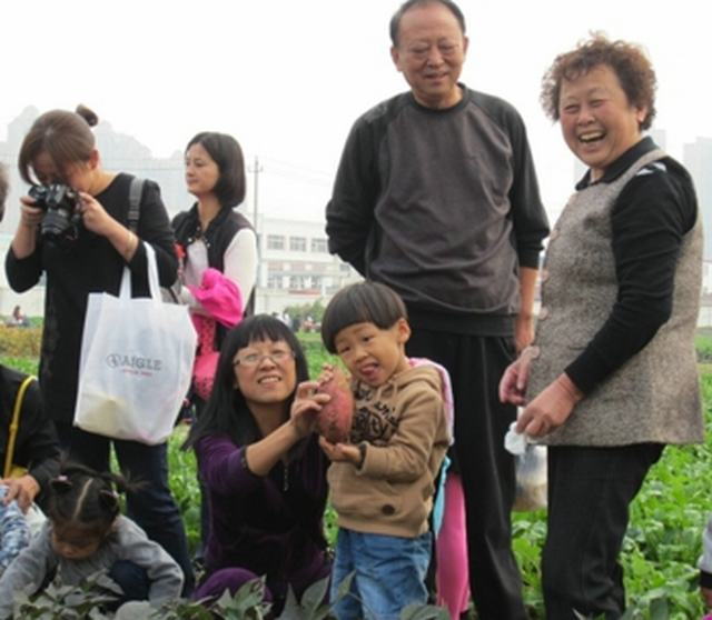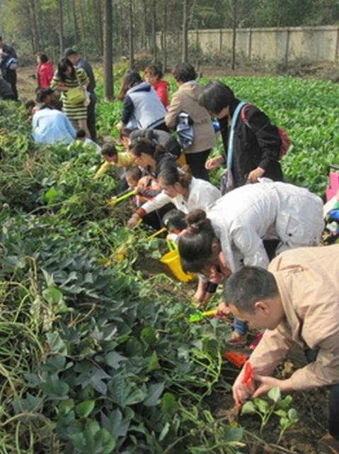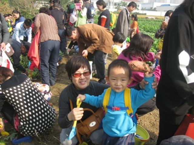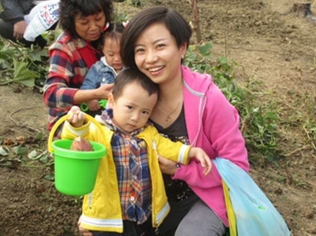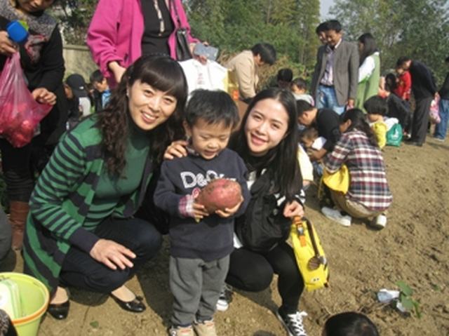 最后,大家来到了红薯地。大片墨绿的红薯藤叶匍匐在地上,像是纯天然的地毯。当家长把这些大片的“地毯”掀开,看到泥土时,宝宝们相当的激动,和爸爸妈妈们哄抢着铲子和钉耙。你瞧,糖糖立马抢过了妈妈手中的铲子,蹲在地上很努力地挖了起来。囡囡的外婆忍不住动起手来,几铲子下去,一个个、一串串红的发紫的“胖娃娃”都露出了笑脸,引得其他宝宝的爸爸妈妈们眼馋极了。眼看着别人都挖出红薯时,萱萱父女俩还在为争铲子而忙活着,最终萱爸爸只好动用了私家工具——双手,让萱萱用小铲子配合,挖啊挖,当大大的红薯出土的一瞬间,大家欢呼雀跃,拎拎看,真重呀!