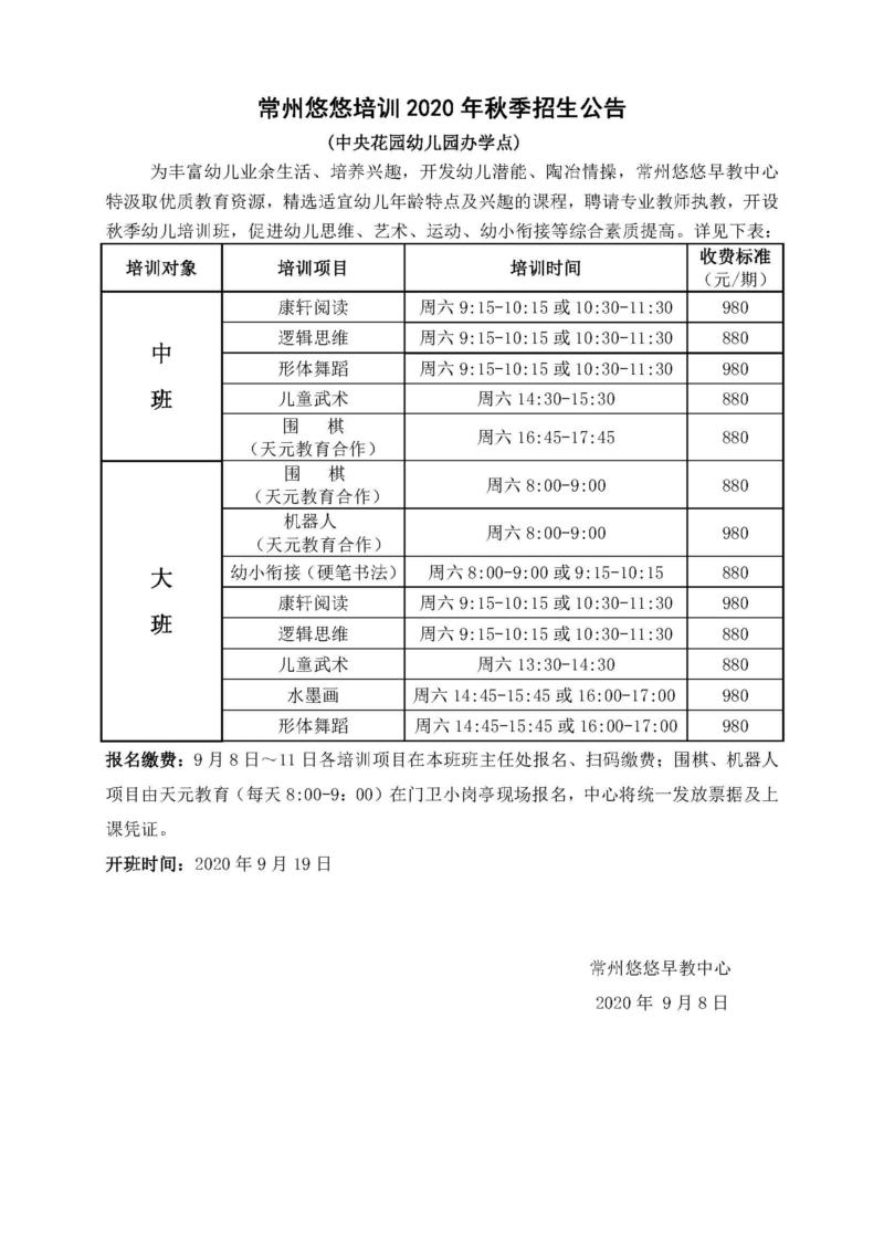 常州悠悠培训2020年秋季招生公告(中央花园幼儿园办学点)