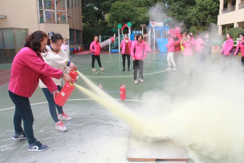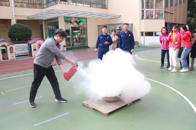 消防指导员还为全体教职工进行了消防安全知识培训,帮助老师更好的了解灭火器具的使用及遇到火情正确的自救方法,通过让老师们实践操作灭火器灭火的方式,深化老师对消防安全的认识。