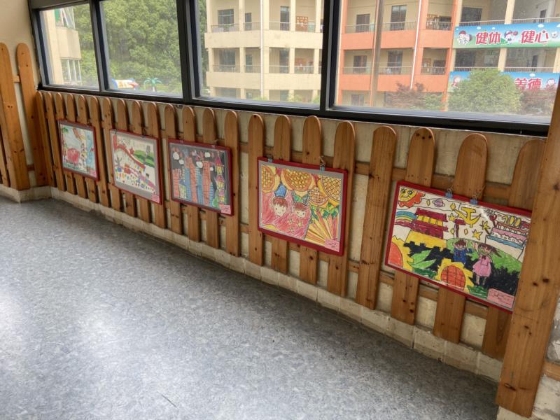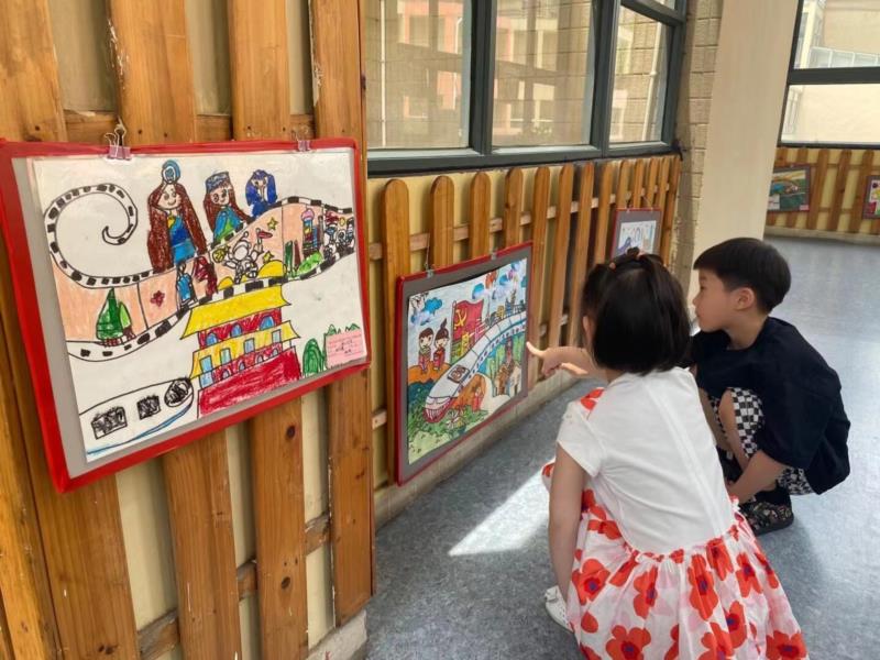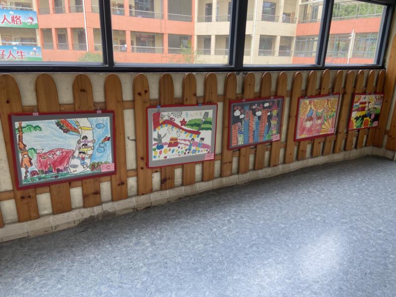 老师们把一幅幅洋溢着童真与童趣的作品悬挂在幼儿园的门厅与走廊上,让红色主题绘画布满每个角落。