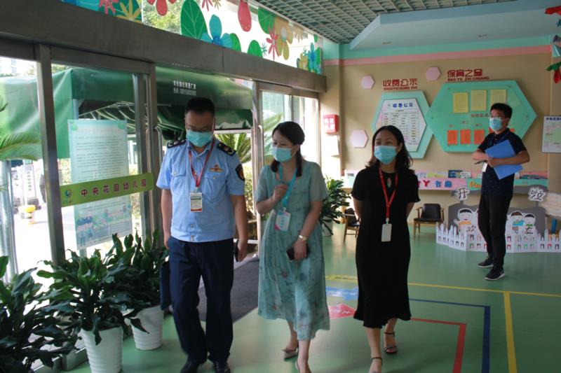 为安全、平稳、有序地推进幼儿园秋学期开学工作,9月7日上午,由新北区派出所、安监、市监、卫生院、综治、三井街道六个部门组成的检查小组莅临我园,开展校园安全工作检查。中央花园幼儿园执行园长王莉明陪同检查验收。