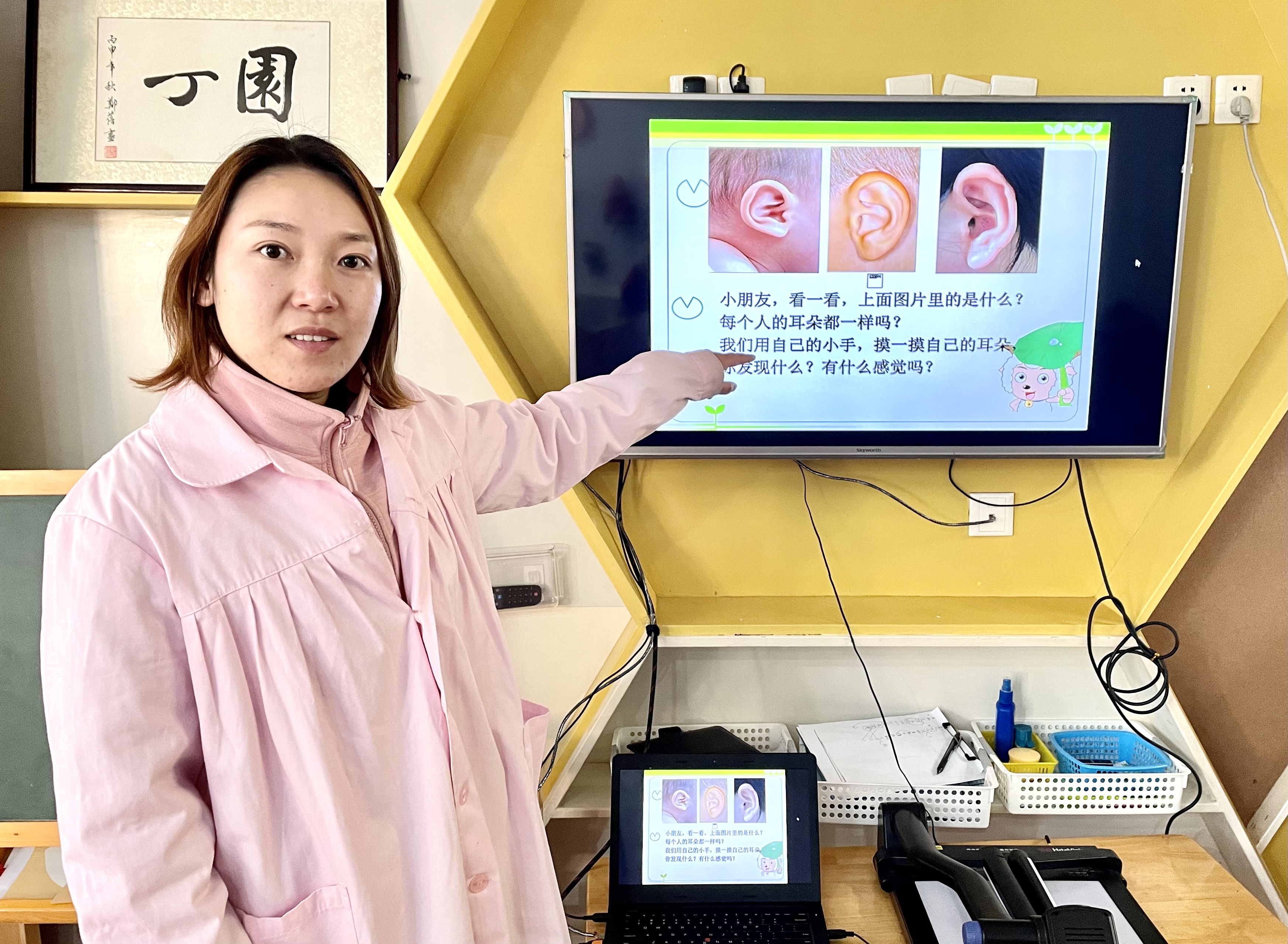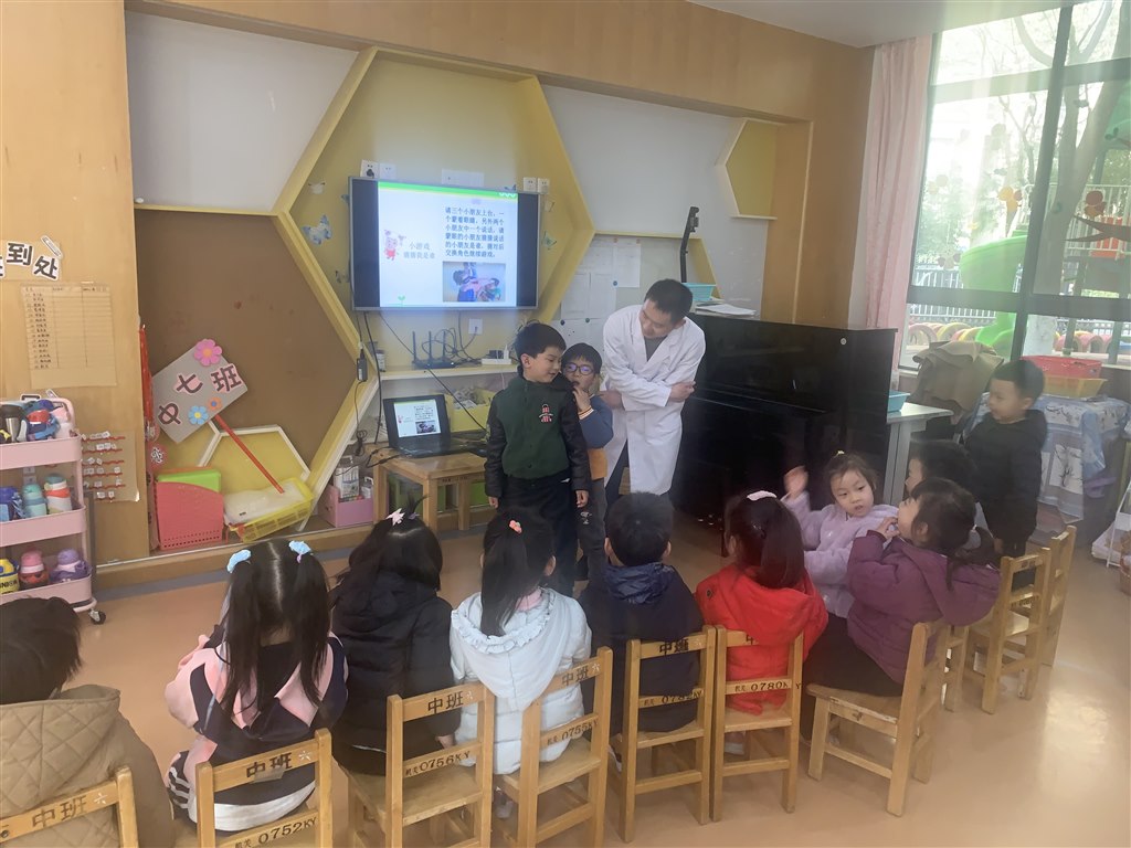 仇医生用谜语和图片的形式,让孩子们认识了耳朵,知道了外耳构造和穴位名称;“听声辨人”游戏,让孩子们体验听觉的重要性,了解保护耳朵的方法;校医和老师带孩子们一起边儿歌边游戏,加强对爱护耳朵的重视,养成良好的用耳习惯。