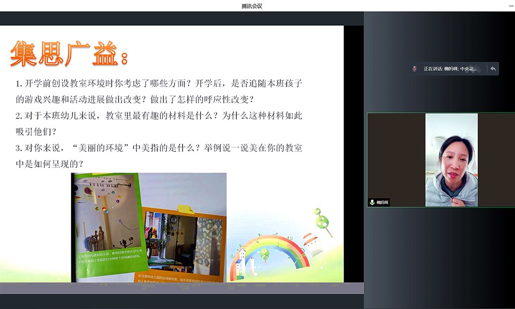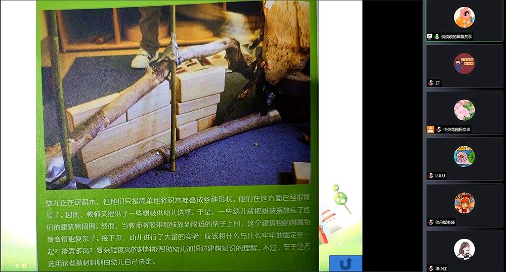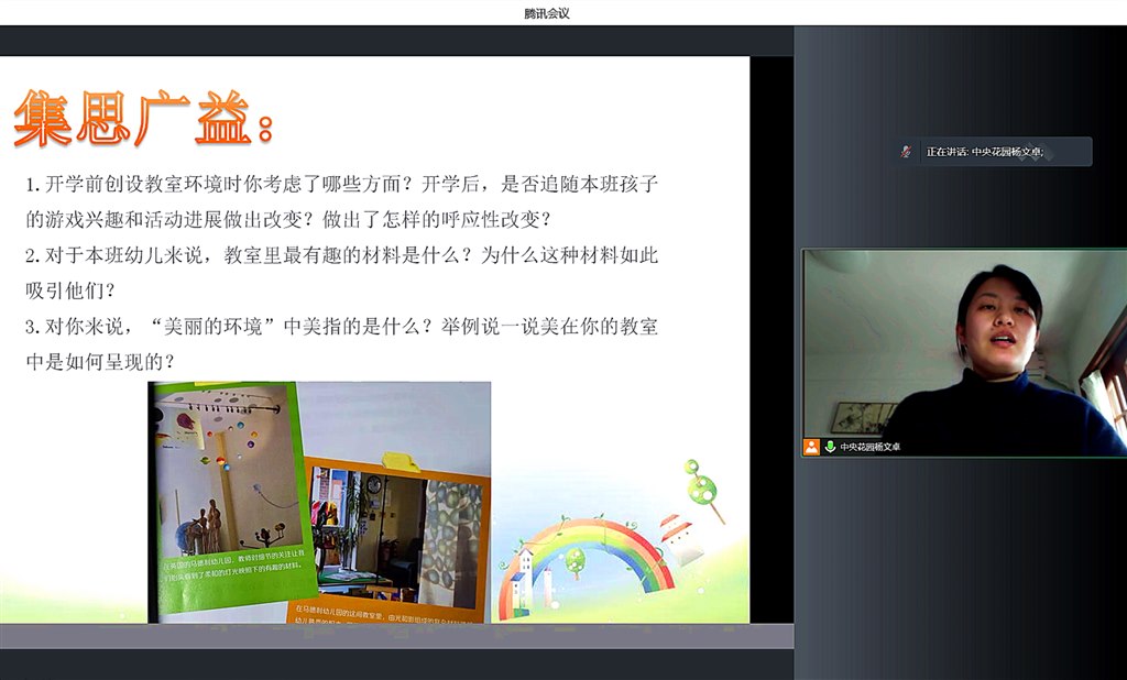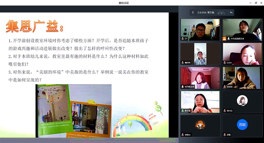 为进一步学习探究性环境创设理念,反思如何创设有内涵、有美感的探究性学习环境,3月24日,中央花园幼儿园领读核心小组通围绕《幼儿园探究性环境创设》一书的导言和第一章内容开展了线上读书沙龙活动。