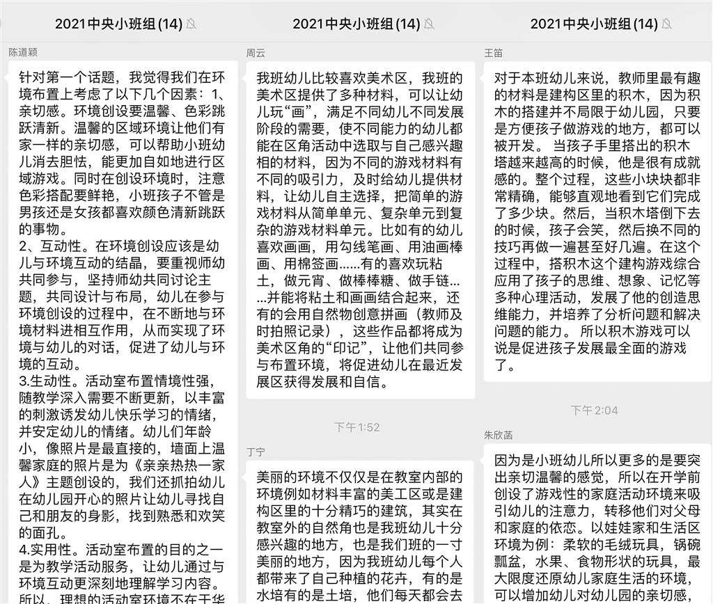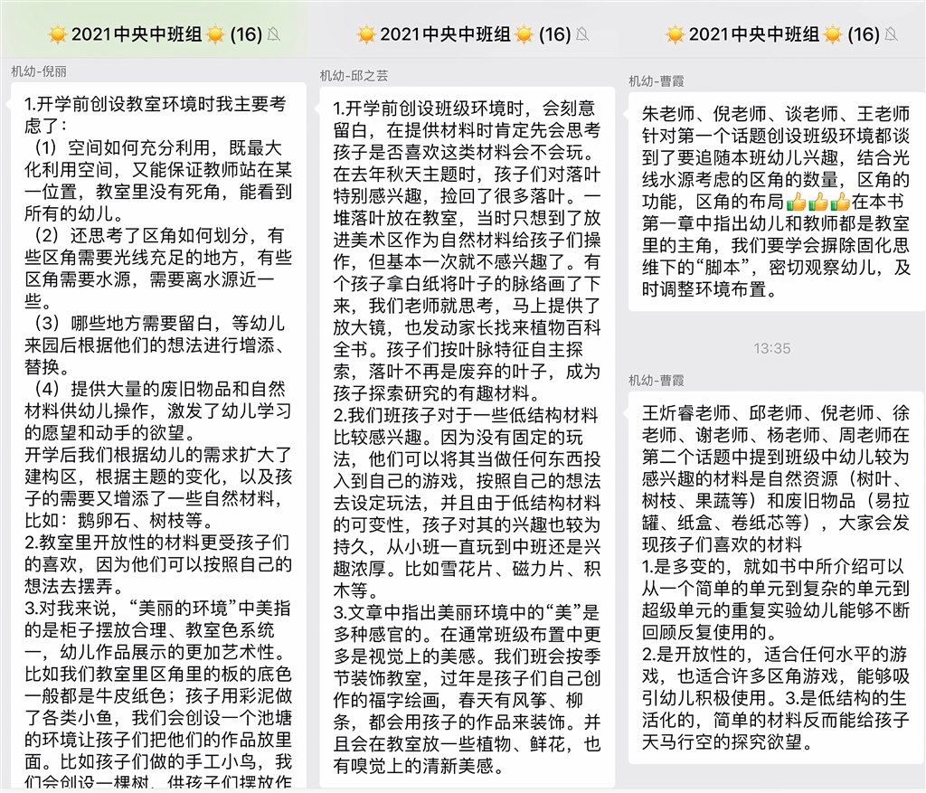领读结束后,各个小组成员就谈老师分享的三个话题展开了思维碰撞,进行了深度的研讨交流。朱老师、堵老师根据自己班级创设环境的经验,指出创设环境需要关注的是班级的布局特点、幼儿的需要、环境的功能性,通过一个个实例简述老师如何追随幼儿的兴趣创设新的探究环境。苏老师、李老师、曹老师、徐老师通过对孩子游戏现场的描述,介绍了老师通过多种材料的投放支架幼儿的游戏,提升幼儿的游戏水平。丁老师、张老师提出创设“美丽”的环境要倾听和尊重孩子的想法与感受,遵循班级的内部构造,并尝试带着设计的理念,去把控环境的层次感。最后,课程主任杨文卓对本次线上读书会进行了复盘梳理,指出通过今天的研讨活动发现老师们支持幼儿发展的水平也在不断提升,课程游戏化的理念已经扎根老师心中。儿童才是环境的主角,在创设环境时,首先要考虑的是儿童的兴趣,同时也要通过丰富的材料促进孩子的探究,要关注材料的开放性、可变性、多元性、挑战性。创设美的班级环境要从班级的实际特点出发,听听孩子们眼中的美。希望老师们以此次读书沙龙为契机,加强自身深度学习的能力,能结合科学理念创设有内涵、有美感的探究性学习环境。