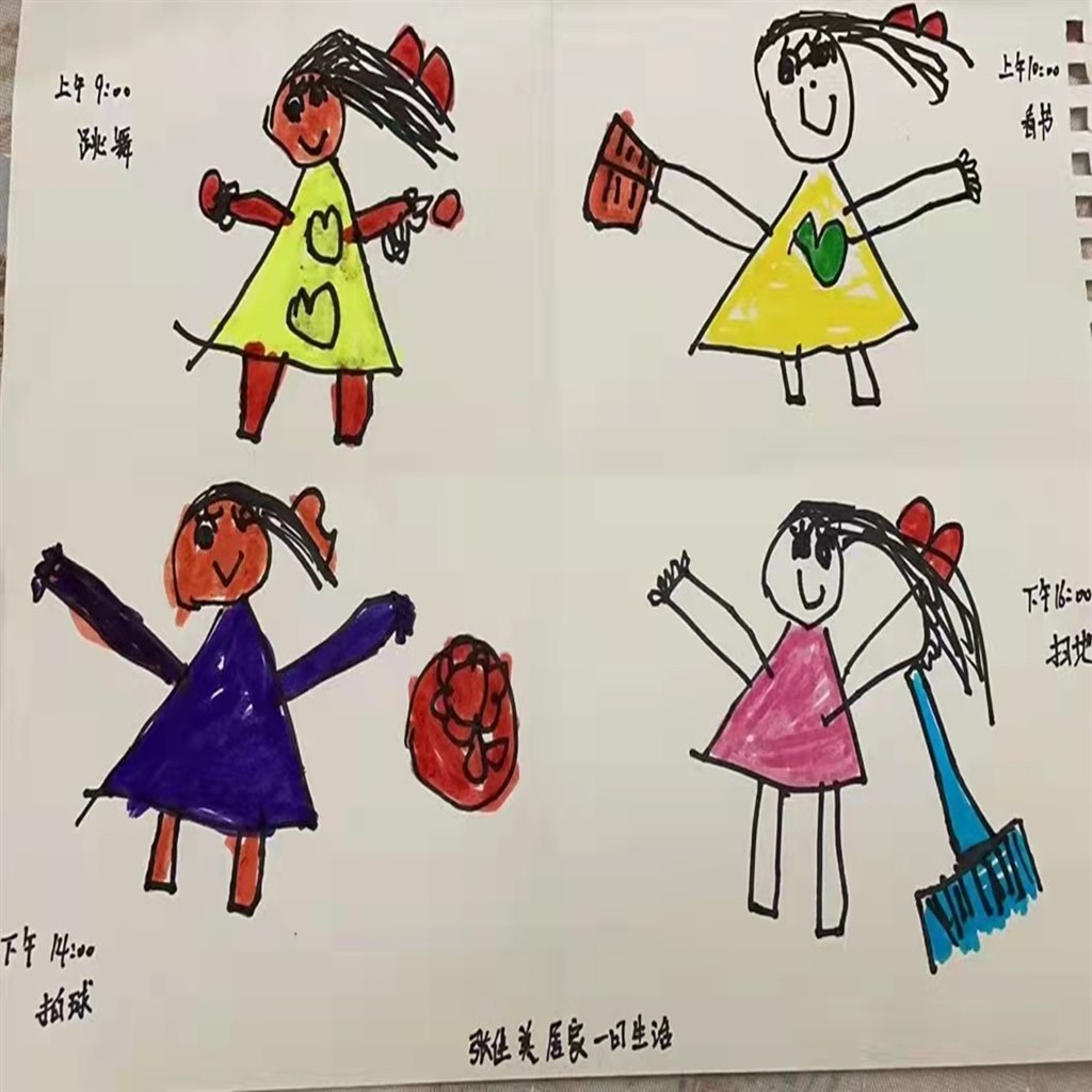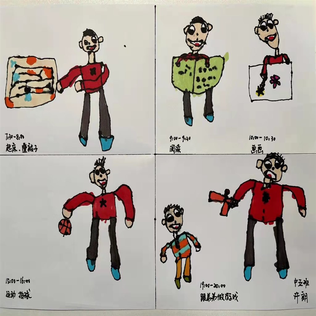 疫情在家可以做哪些事情让自己变得更健康、聪明、能干呢?孩子们尝试以绘画的方式记录、计划,自主安排居家一日生活,学习合理分配时间。