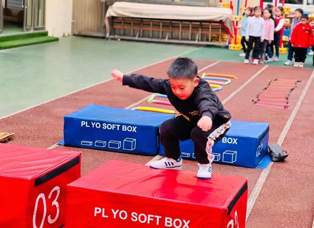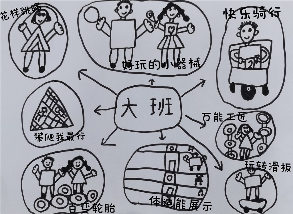 大班哥哥姐姐开展健康运动展示,与户外运动资源互动,与同伴合作,锻炼体魄,展现风采。
