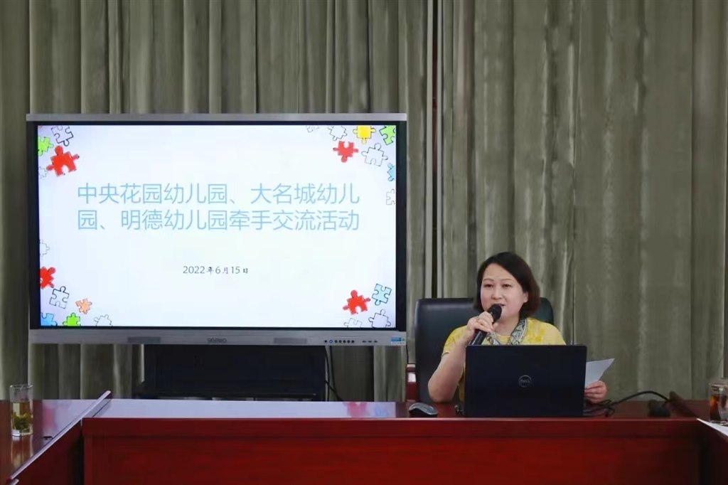 为了充分发挥中央花园幼儿园的示范引领作用,向牵手姐妹园辐射近阶段课改成果,6月15日下午,大名城幼儿园和明德幼儿园的老师走进我园,展开一次互学交流活动。
