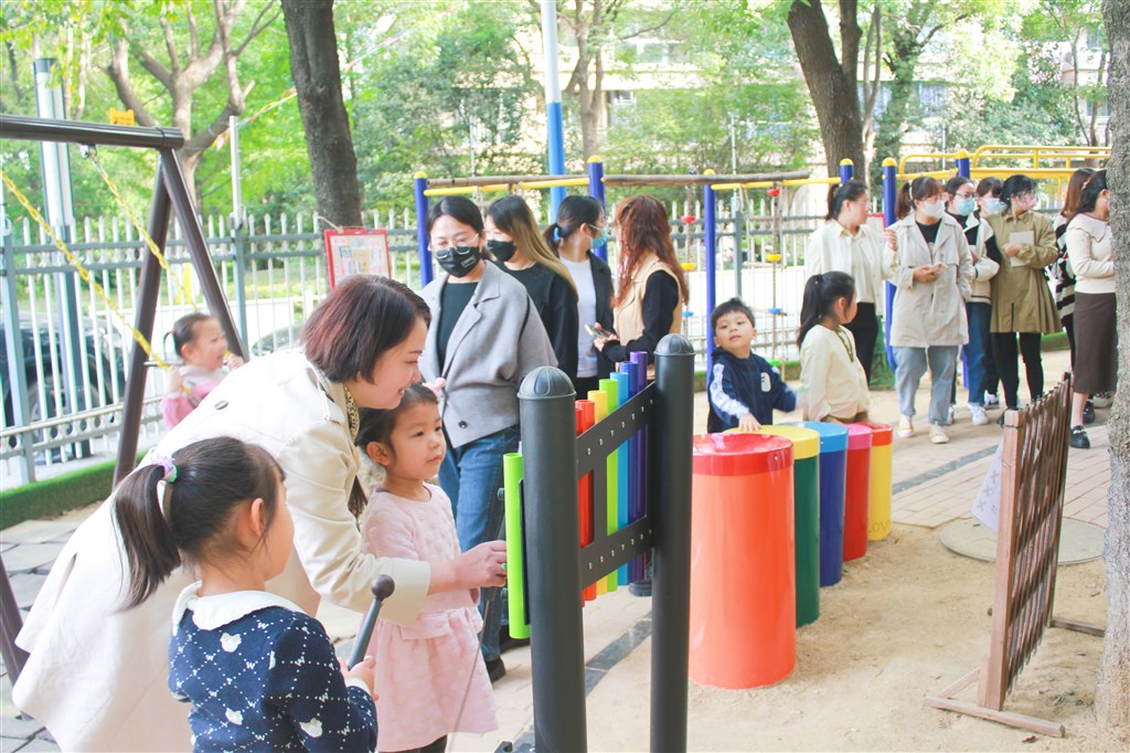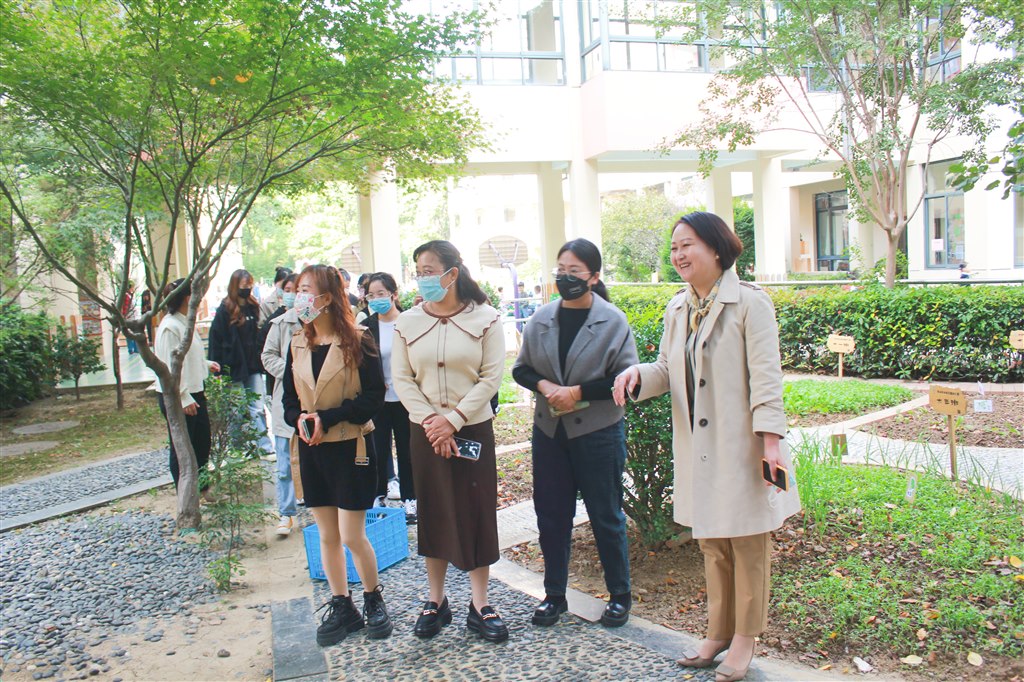 在王莉明园长和肖继群助理的陪同下,老师们深入班级,参观各班全区域班级游戏环境,并观摩了幼儿晨间户外游戏。
