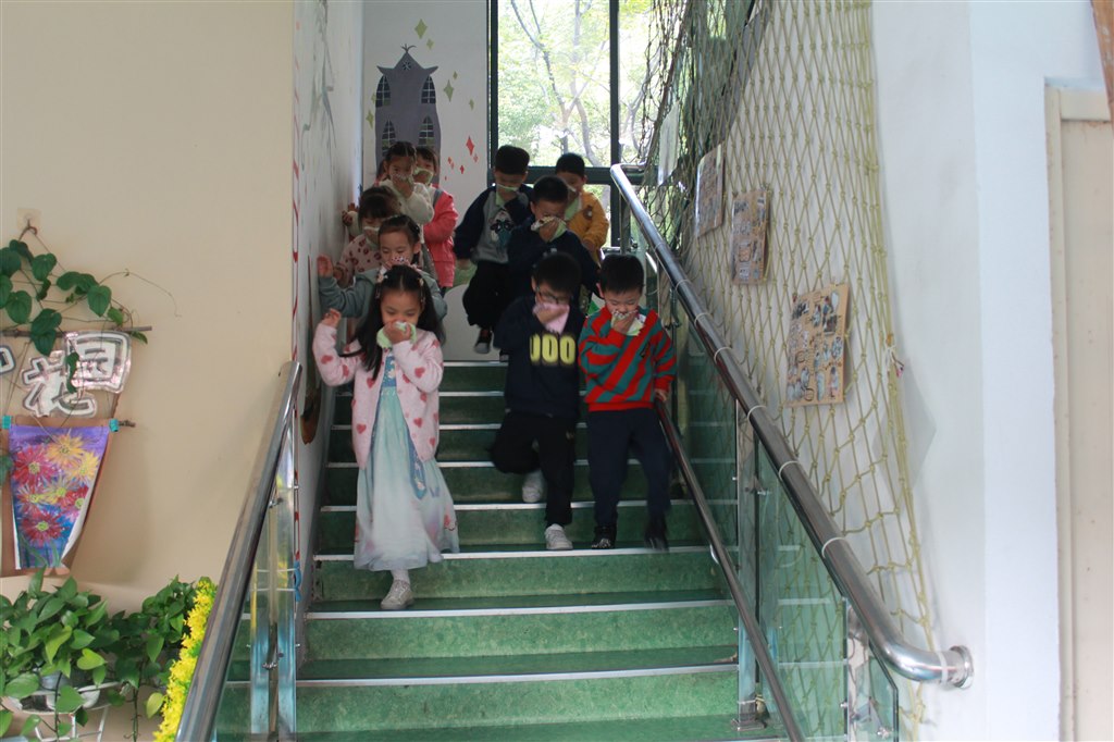 14:30分警报声响起,消防疏散演练拉开了序幕。各班幼儿听见警报声后,在老师的带领下,用毛巾捂住口鼻井然有序的沿着安全通道紧急疏散。演习结束后,消防员官兵为孩子们进行了消防安全知识普及。
