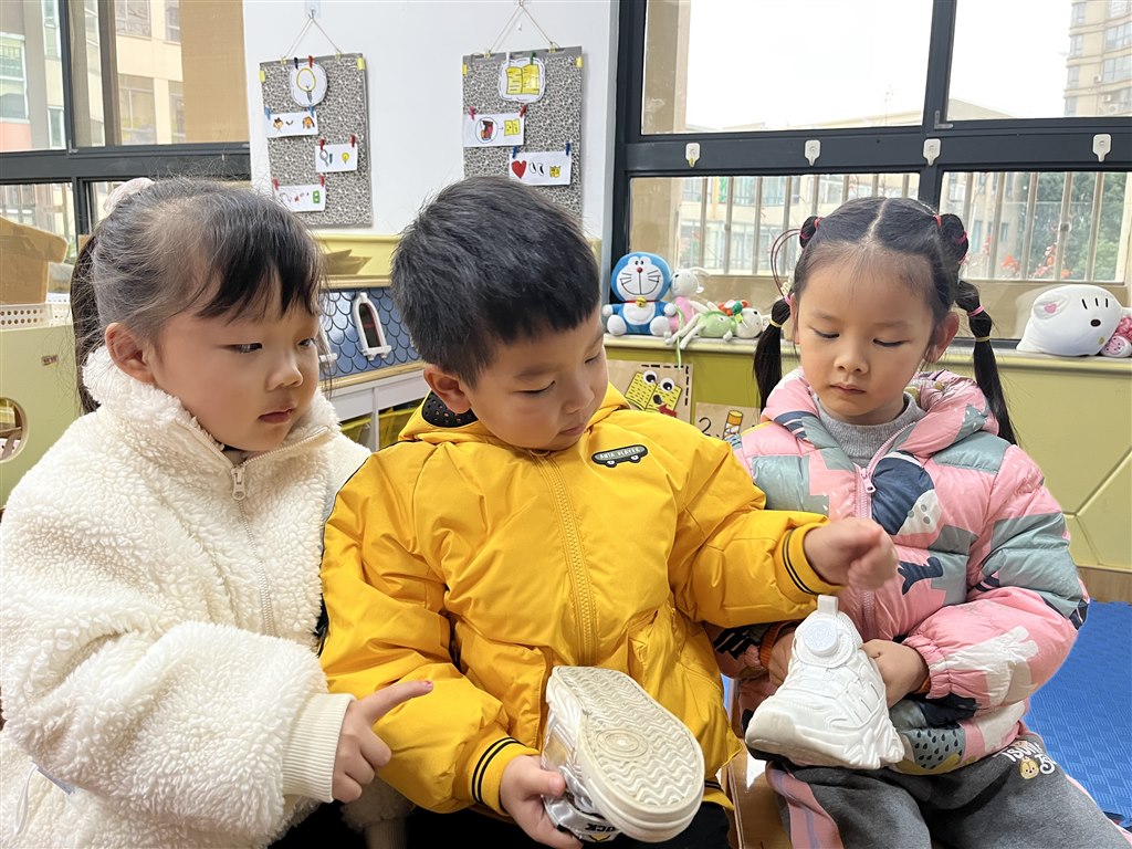 鞋子虽然是我们生活中常见的物品,但是极少去观察鞋子。孩子们初次把目光聚焦在了鞋子上,围绕我的鞋子是什么样子的呢?对鞋子进行了一个仔细的研究。