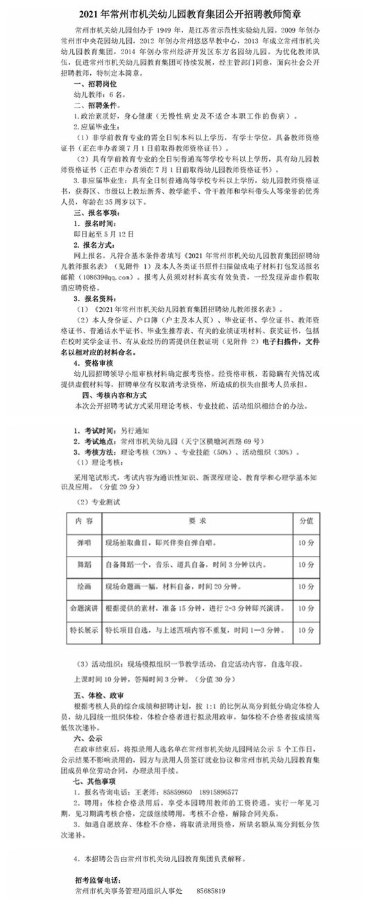 2021年常州市机关幼儿园教育集团公开招聘教师简章