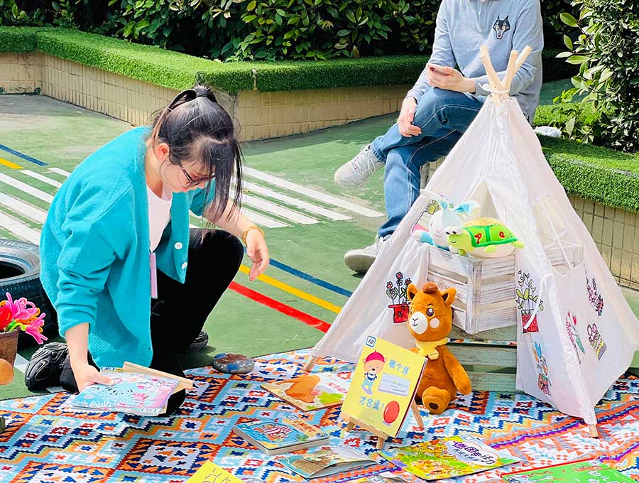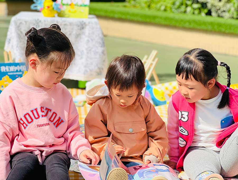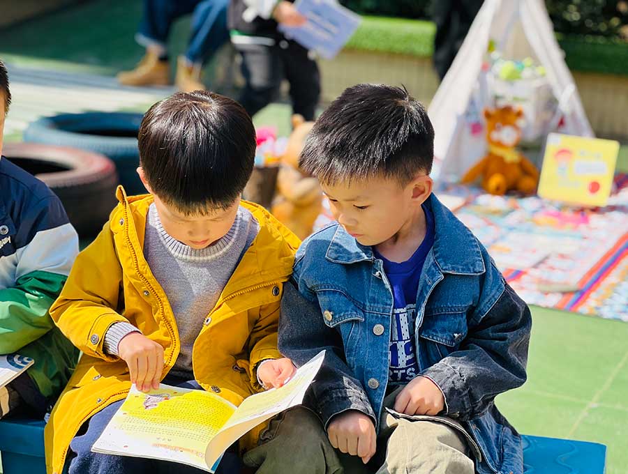 中班哥哥姐姐与小班弟弟妹妹自由结伴,共浴书香之馨,大带小的陪伴,阅读中透着满满的幸福与快乐。